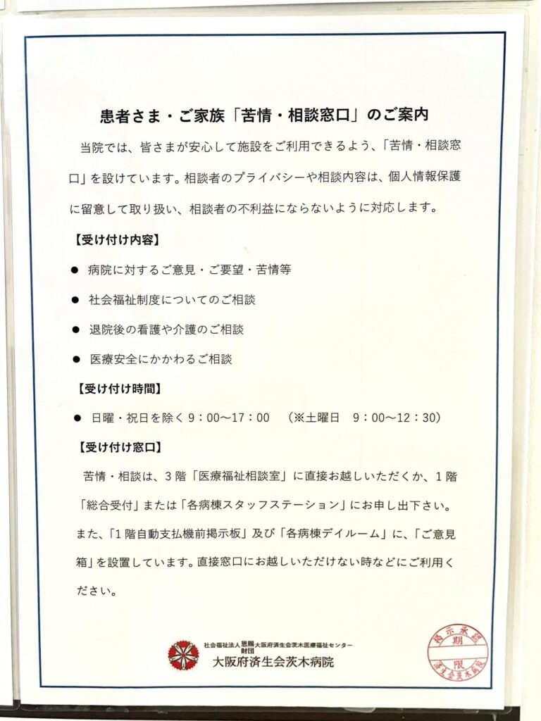 当院では、「患者相談窓口」を設置しておりますので、お気軽にご利用ください。診療内容に関すること、医療費に関すること、職員の接遇に関すること、退院後のこと、病気に関するいろいろな相談事、患者さんの立場に立ち、問題解決のためのお手伝いをします。