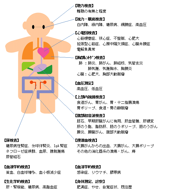 | 血液検査 | 赤血球数、白血球数、血色素量(ヘモグロビン)、ヘマトクリット、血小板数、MCV、MCH、MCHC、総コレステロール、HDLコレステロール、LDLコレステロール、中性脂肪、空腹時血糖、HbA1c、AST(GOT)、ALT(GPT)、γ-GTP、ALP、総ビリルビン、総蛋白、アルブミン、アミラーゼ、尿素窒素、血清クレアチニン、eGFR、尿酸、HBs抗原、梅毒反応、CRP、血液型(ABO、Rh) |