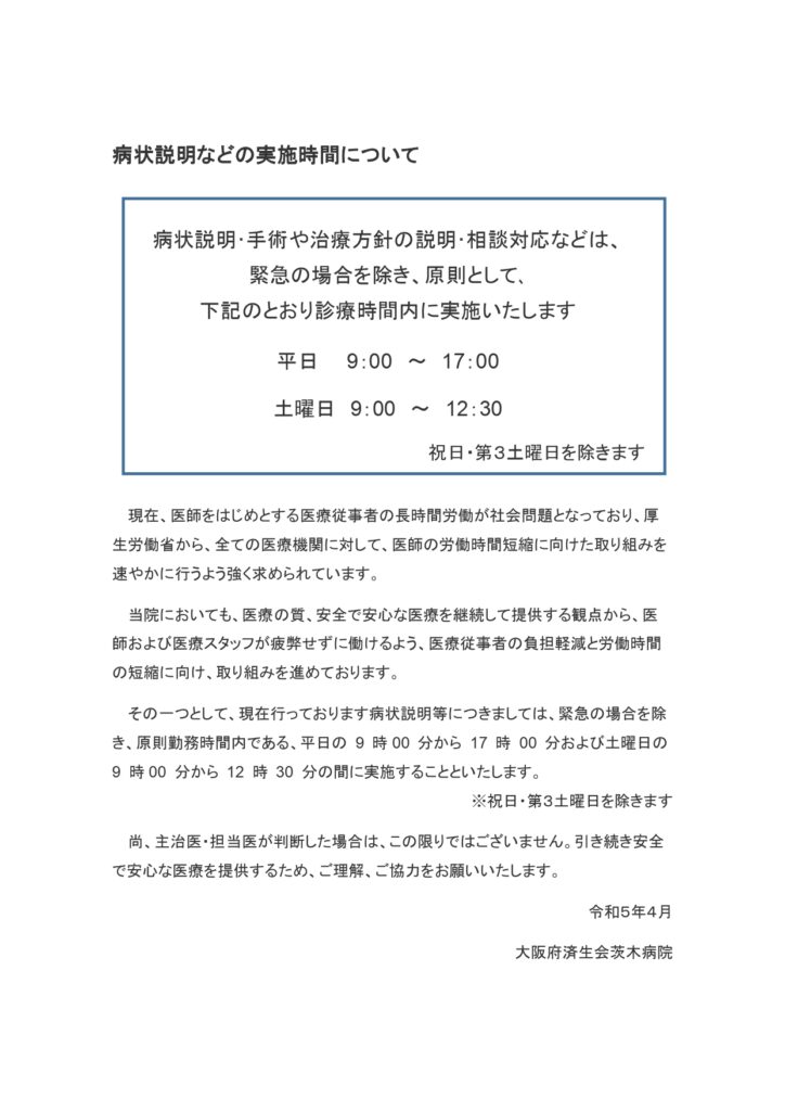 外来縮小の取り組み・医師と医療関係職種における役割分担に対する取り組み、医療関係職種と事務職員等における役割分担に対する取り組み、医師の負担軽減に対する取り組み、看護職員の負担軽減に関する取り組み等 - 当院では、屋内外を問わず「病院敷地内全面禁煙」となっておりますので、ご理解とご協力をお願いいたします。