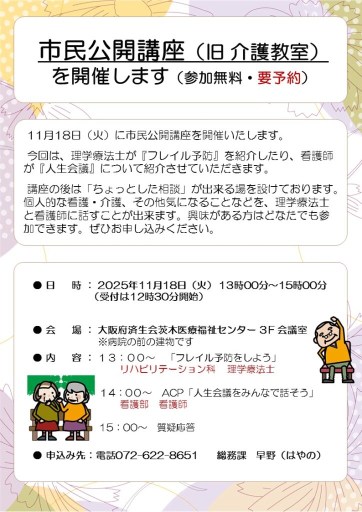 参加のご予約については、当院総務課 担当:早野(はやの)まで。済生会茨木病院 代表電話 072-622-8651