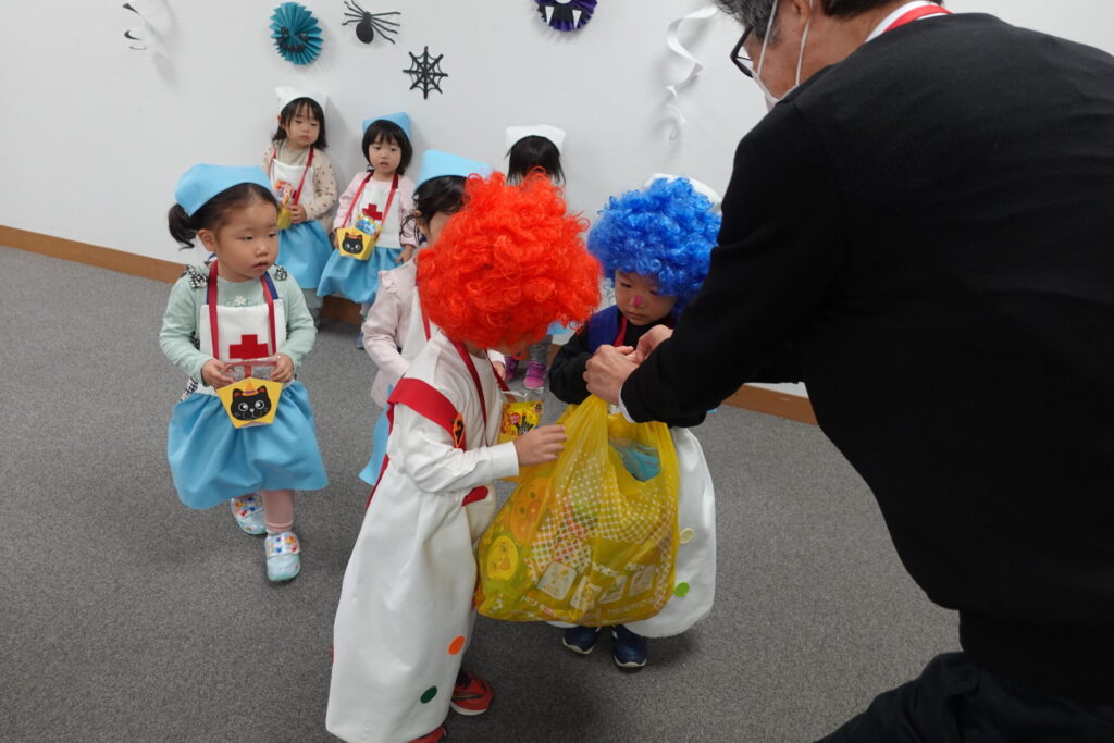 職員が手作りしたナース服とピエロの衣装に身を包み、病院職員からお菓子を手渡しされました。