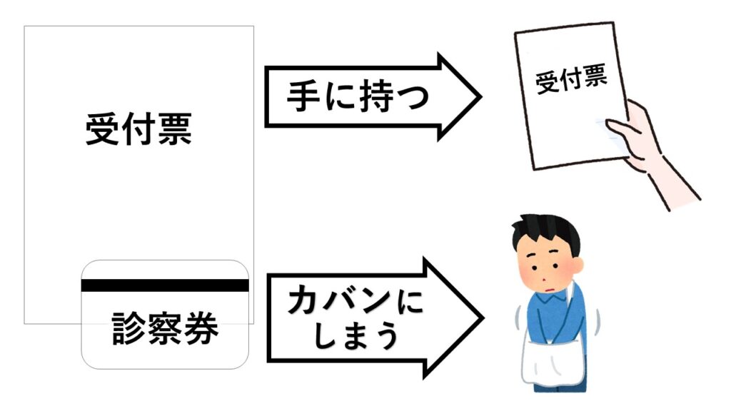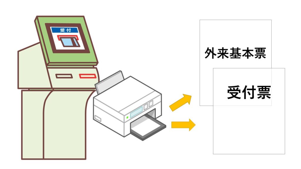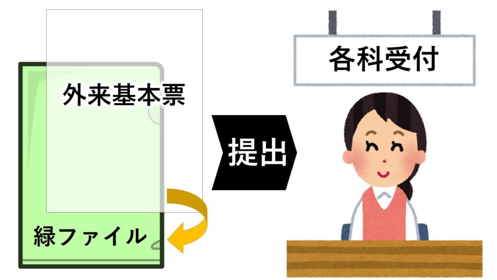 再来機で受付をすると診療内容の順番が書かれた外来基本票と受付票が印刷されますので、ご自身で緑ファイルに入れてください。