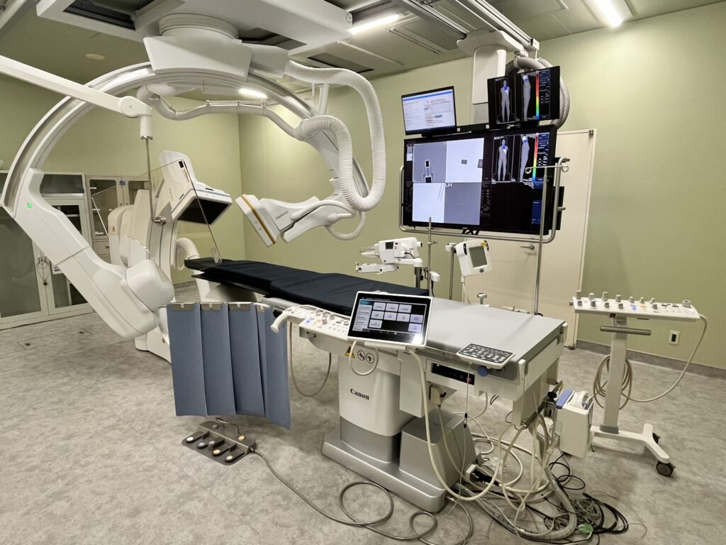 血管撮影装置は、英語で「Angiography(アンギオグラフィィー)」略してAngio(アンギオ)と呼ばれ、造影剤を注入しながら目的の部位にX線を照射することで、血管の様子をリアルタイムに映し出すことができる装置です。